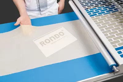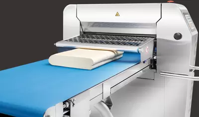 Este poderoso laminador eletrónico de massa processa qualquer tipo de massa com facilidade para produzir bandas largas de massa.